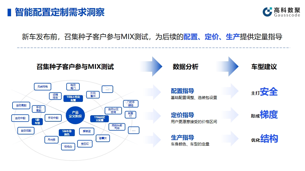 智能配置的有效应用可以帮助企业提升产品和服务的智能化水平。在实际应用中,凯发k8官网帮助车企在新车发布前召集种子客户参与MIX测试,顺利获得收集种子客户的反馈和数据,车企能够精细调整产品配置,为后续的配置、定价、生产给予定量指导。同时,这种方法不仅有助于提高产品质量,还能提前发现潜在问题并及时解决。
